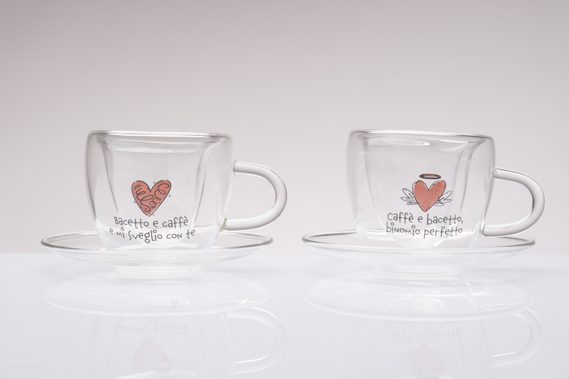 Set 2 tazzine caffè in vetro borosilicato, versando il caffè grazie alla particolare lavorazione si vedrà un cuore, completo di sacchetto con confetti e scatola Cuorematto, cm Ø 7 x 7 H – ml 80 – piattino cm 11 Ø. Il prezzo indicato include la confezione con nastri in doppio raso, organza, o una combinazione di entrambe i materiali.