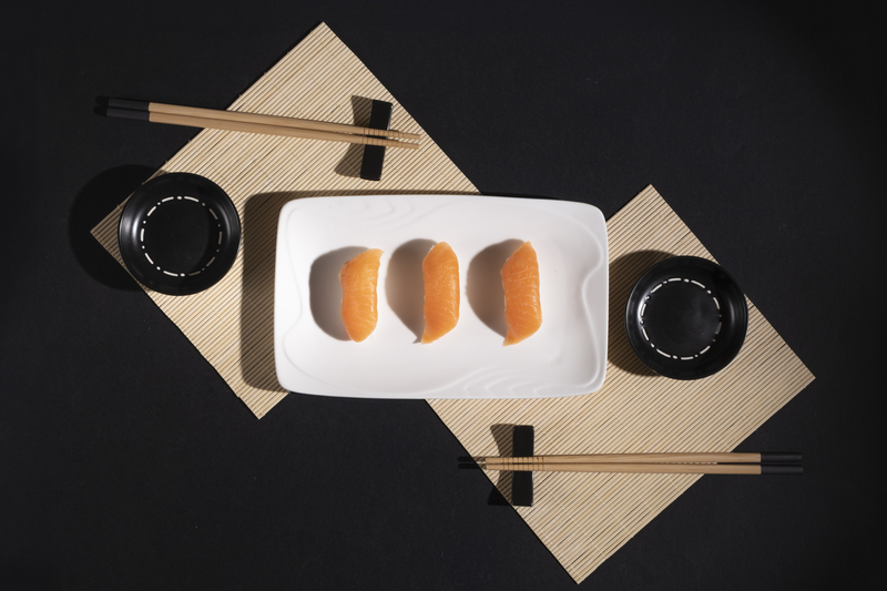 Set sushi (9 pz.) composto da 1 vassoio + 2 ciotole in porcellana, bacchette con poggia bacchette e tovagliette in midollino, completo di sacchetto con confetti e scatola Cuorematto, vassoio cm 12 x 15 x 2 H. Il prezzo indicato include la confezione con nastri in doppio raso, organza, o una combinazione di entrambe i materiali.