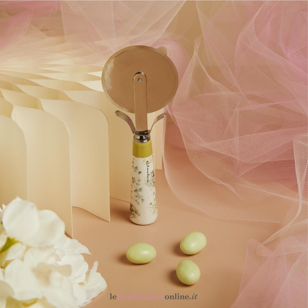 Tagliapizza manico in porcellana con decoro floreale verde, h 15 cm, completo di porta confetti in tessuto con bottone madraperlato. Il prezzo indicato include la confezione con nastri in doppio raso, organza, o una combinazione di entrambe i materiali.