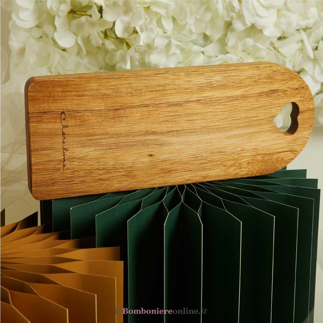Tagliere in acacia, 30 x 12 x 1.2 cm, completo di porta confetti in tessuto con bottone madreperlato. Il prezzo indicato include la confezione con nastri in doppio raso, organza, o una combinazione di entrambe i materiali.