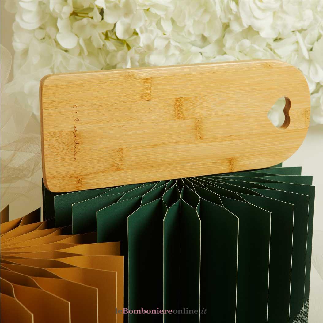 Tagliere in bamboo, 30 x 12 x 1.2 cm, completo di porta confetti in tessuto con bottone madreperlato. Il prezzo indicato include la confezione con nastri in doppio raso, organza, o una combinazione di entrambe i materiali.