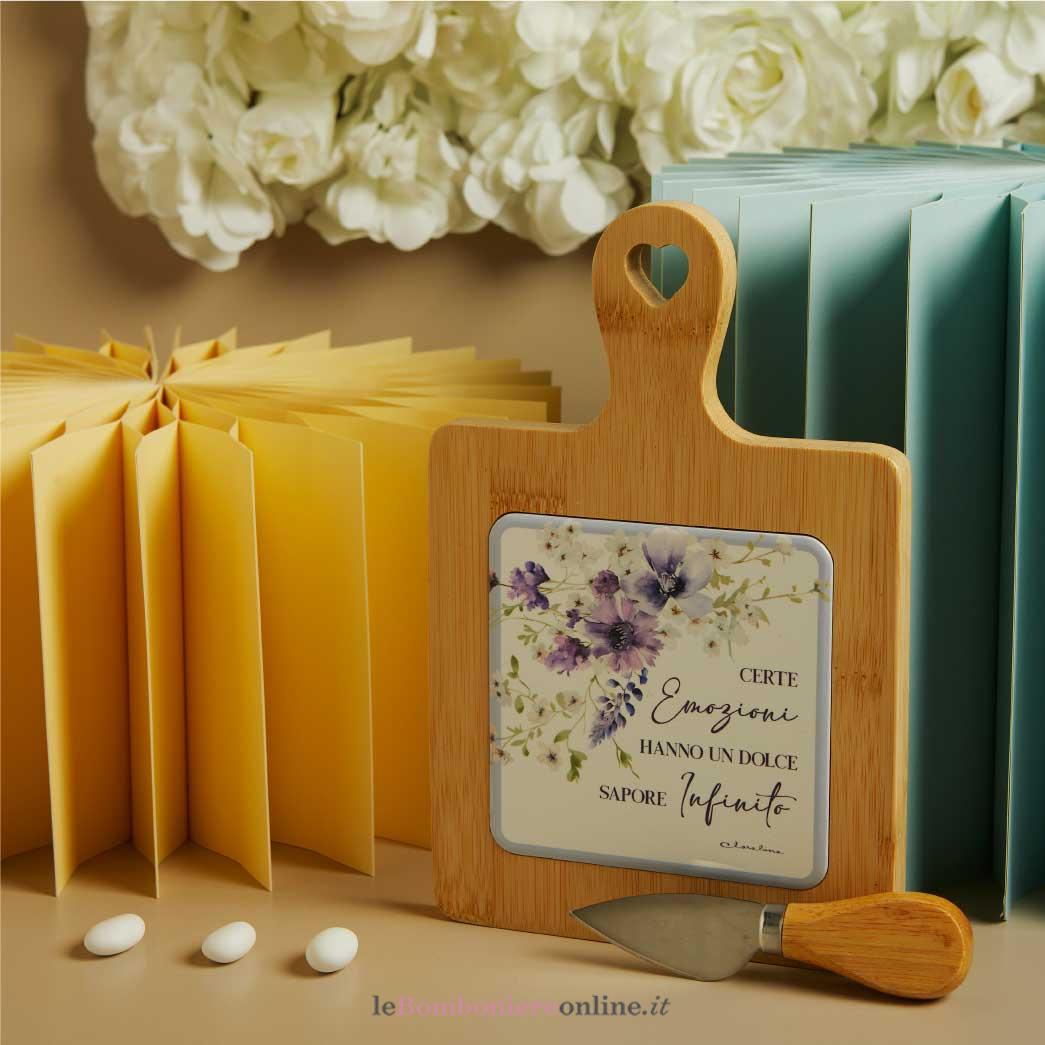 Tagliere in bamboo con decoro floreale lilla e frase “Certe emozioni hanno un dolce sapore infinito”, a scelta con coltellino formaggi, 23 x 15 x 1.5 cm, completo di porta confetti in tessuto con bottone madreperlato. Il prezzo indicato include la confezione con nastri in doppio raso, organza, o una combinazione di entrambe i materiali.