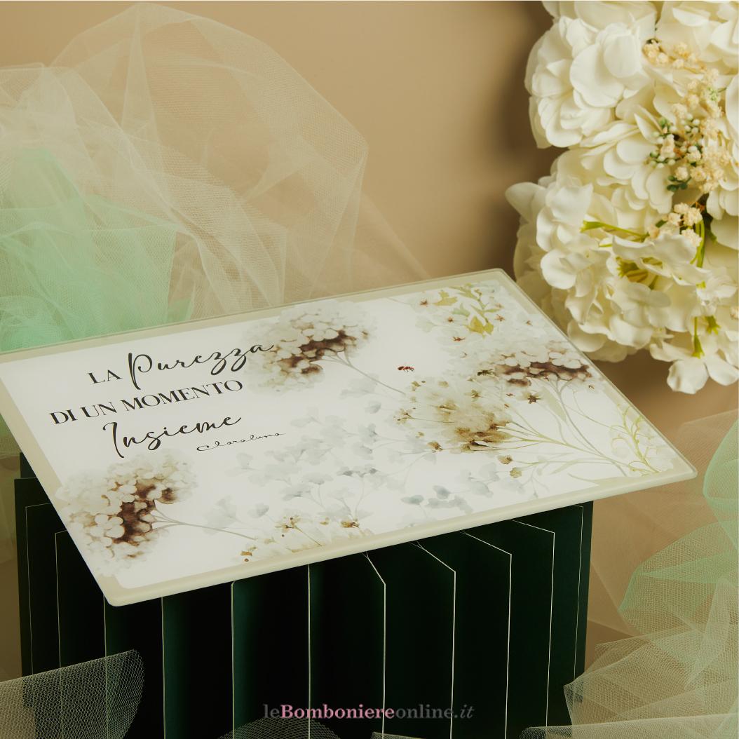 Tagliere in vetro con decoro floreale verde, 20 x 30 cm, a scelta con coltellino formaggi con manico in porcellana con decoro floreale verde, completo di porta confetti in tessuto con bottone madreperlato e scatola regalo Claraluna decoro coordinato. Il prezzo indicato include la confezione con nastri in doppio raso, organza, o una combinazione di entrambe i materiali.
