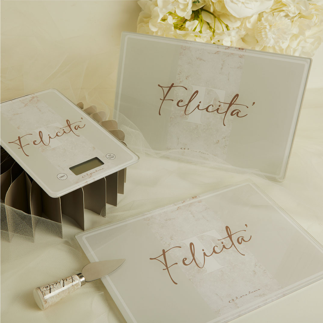 Tagliere in vetro con scritta “Felicità”, 20 x 30 cm, a scelta con coltellino formaggi con manico in porcellana con scritta “Felicità”, completo di porta confetti in tessuto con bottone madreperlato e scatola regalo Claraluna decoro coordinato. Il prezzo indicato include la confezione con nastri in doppio raso, organza, o una combinazione di entrambe i materiali.