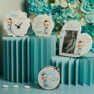 Tamburello decoro bimbo maschio, 10.2 x 4.2 cm, completo di porta confetti. Il prezzo indicato include la confezione con nastri in doppio raso, organza, o una combinazione di entrambe i materiali.