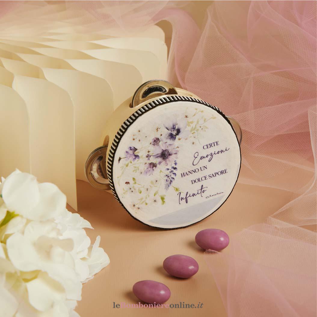 Tamburello con decoro floreale lilla, 10.2 x 4.2 cm, completo di porta confetti. Il prezzo indicato include la confezione con nastri in doppio raso, organza, o una combinazione di entrambe i materiali.