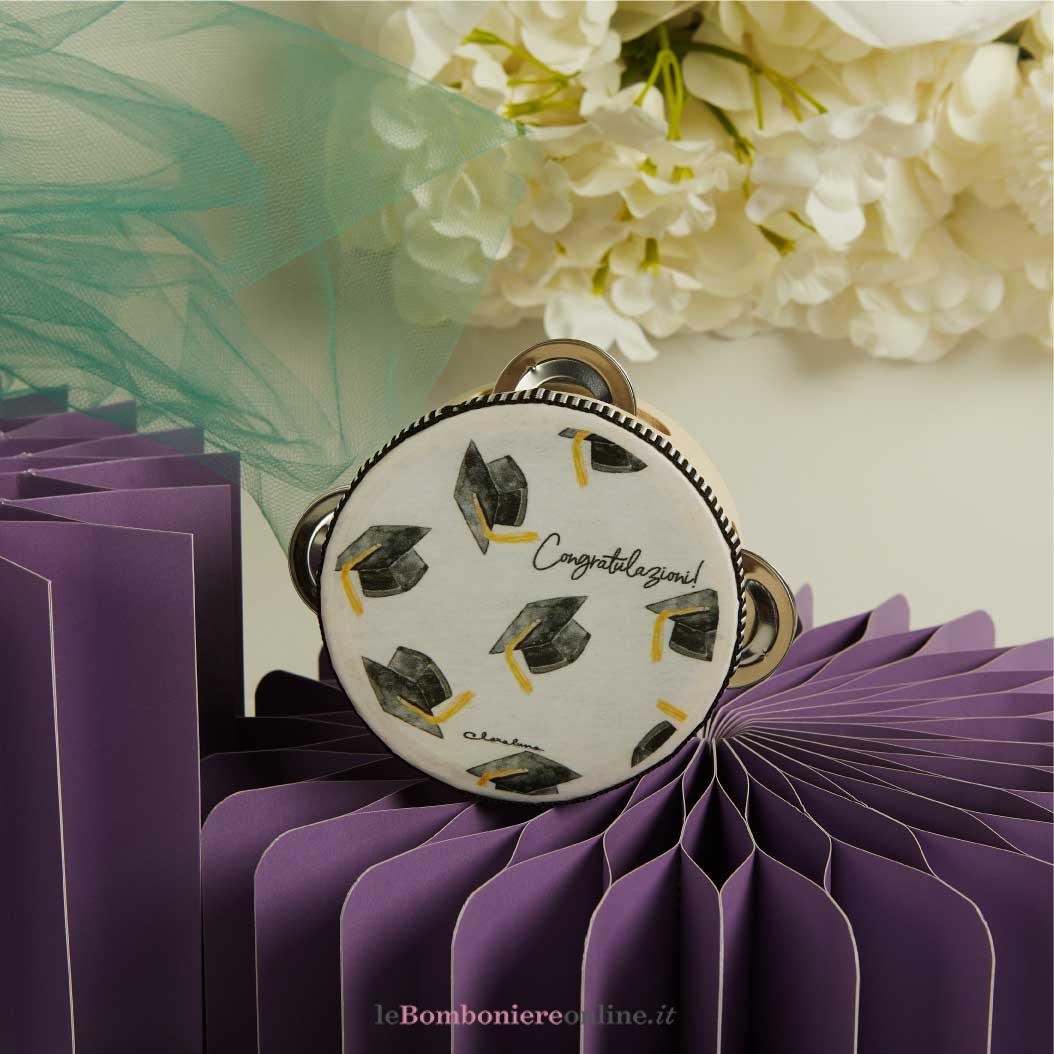 Tamburello laurea con scritta “Congratulazioni”, 10.2 x 4.2 cm, completo di porta confetti. Il prezzo indicato include la confezione con nastri in doppio raso, organza, o una combinazione di entrambe i materiali.