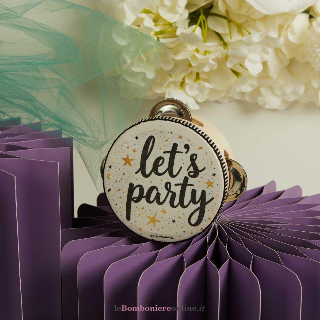 Tamburello con scritta “Let’s Party”, 10.2 x 4.2 cm, completo di porta confetti. Il prezzo indicato include la confezione con nastri in doppio raso, organza, o una combinazione di entrambe i materiali.