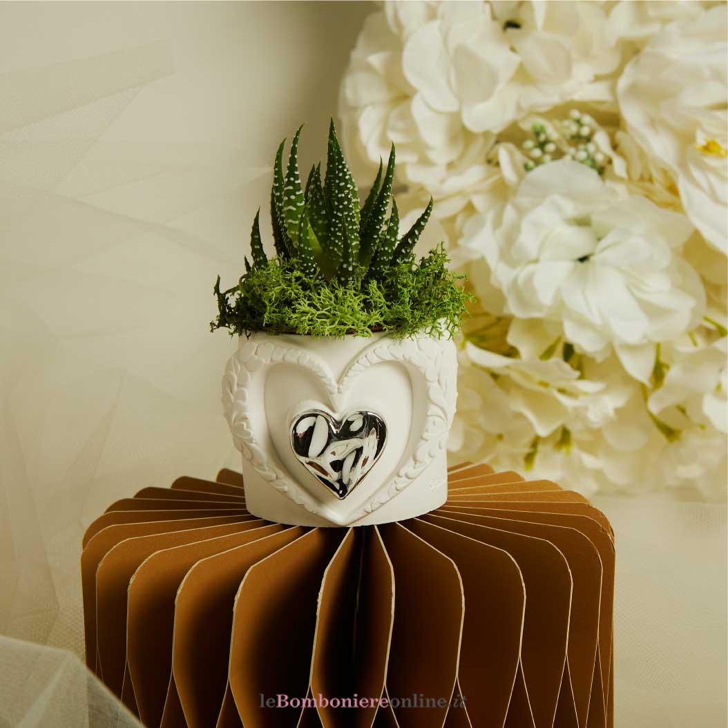 Vasetto cuore in gesso con applicazione cuore silver, piantina grassa “Haworthia” con muschio, 6 x 6.5 cm, completo di porta confetti in tessuto con bottone madreperlato. Il prezzo indicato include la confezione con nastri in doppio raso, organza, o una combinazione di entrambe i materiali.