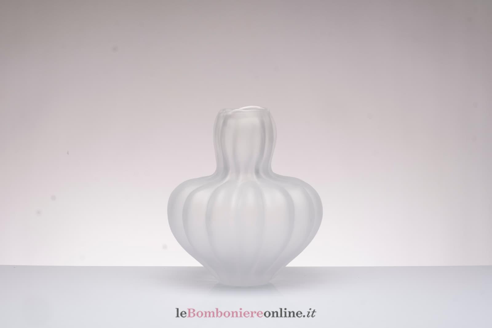 Vaso in vetro satinato bianco, cm 27 H. Il prezzo include la confezione con nastri in doppio raso, organza, o una combinazione di entrambe i materiali.