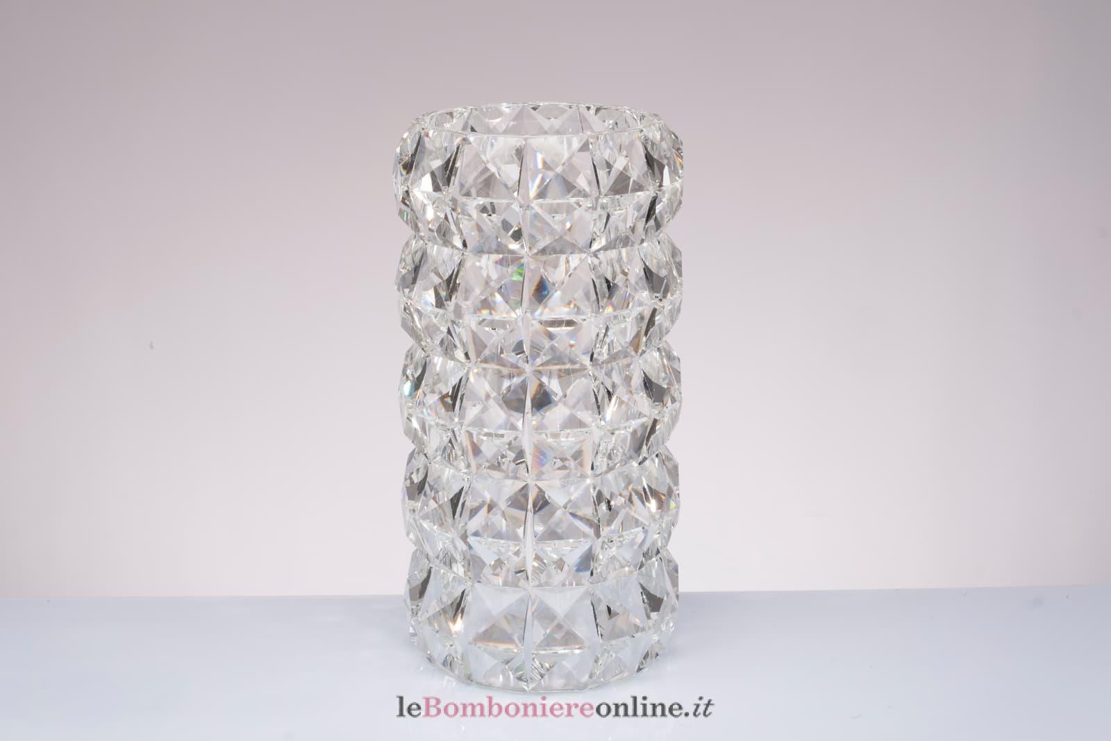 Vaso in cristallo, cm Ø 12 x 30 H, compreso di sacchetto porta confetti e la scatola regalo Morena Design. Il prezzo include la confezione con nastri in doppio raso, organza, o una combinazione di entrambe i materiali.