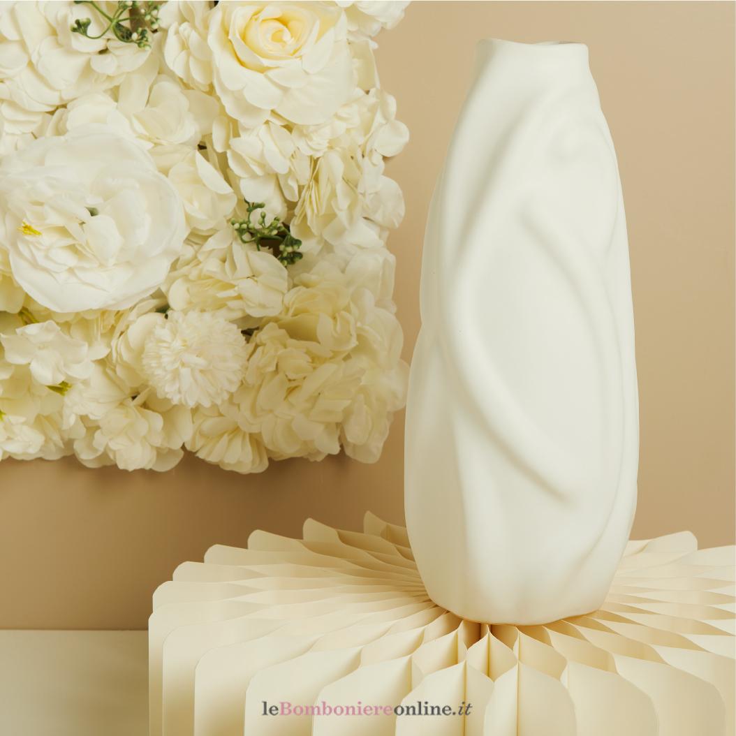 Vaso in porcellana onde, 13 x 13 x 30.5 cm, tulipani ordinabili a parte con codice 26994, completo di porta confetti in tessuto con bottone madreperlato e scatola regalo Claraluna. Il prezzo indicato include la confezione con nastri in doppio raso, organza, o una combinazione di entrambe i materiali.