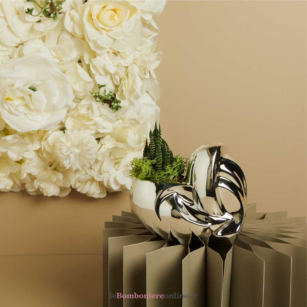 Vaso cuore in porcellana silver con piantina grassa “Haworthia” e muschio, 13.5 x 9 x 12.5 cm, completo di porta confetti in tessuto con bottone madreperlato. Il prezzo indicato include la confezione con nastri in doppio raso, organza, o una combinazione di entrambe i materiali.