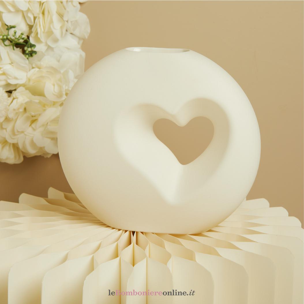 Vaso in porcellana tondo con foro a cuore, 22.6 x 7.2 x 19.9 cm, tulipani ordinabili a parte con codice 26993, completo di porta confetti in tessuto con bottone madreperlato e scatola regalo Claraluna. Il prezzo indicato include la confezione con nastri in doppio raso, organza, o una combinazione di entrambe i materiali.